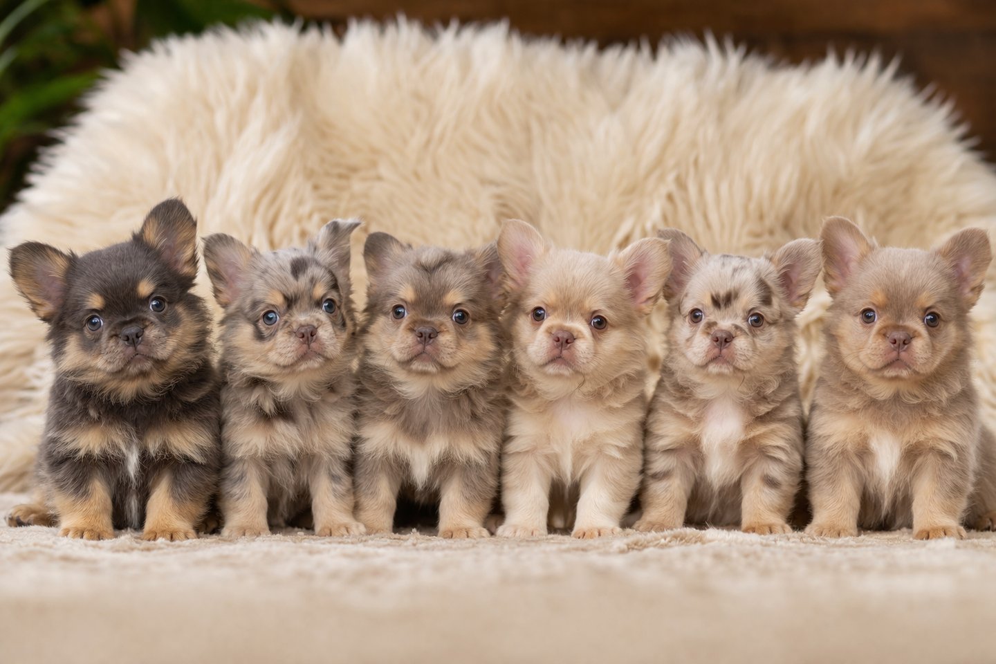 This thoughtfully planned pairing is expected to produce a stunning variety of full fluffy French Bulldogs, including: